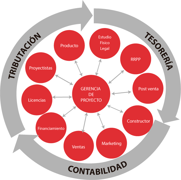 Esta actividad comprende el control de todas las fases precisas en la ejecución de un Proyecto desde el diseño y construcción hasta las labores propias de la gestión jurídica y financiera.